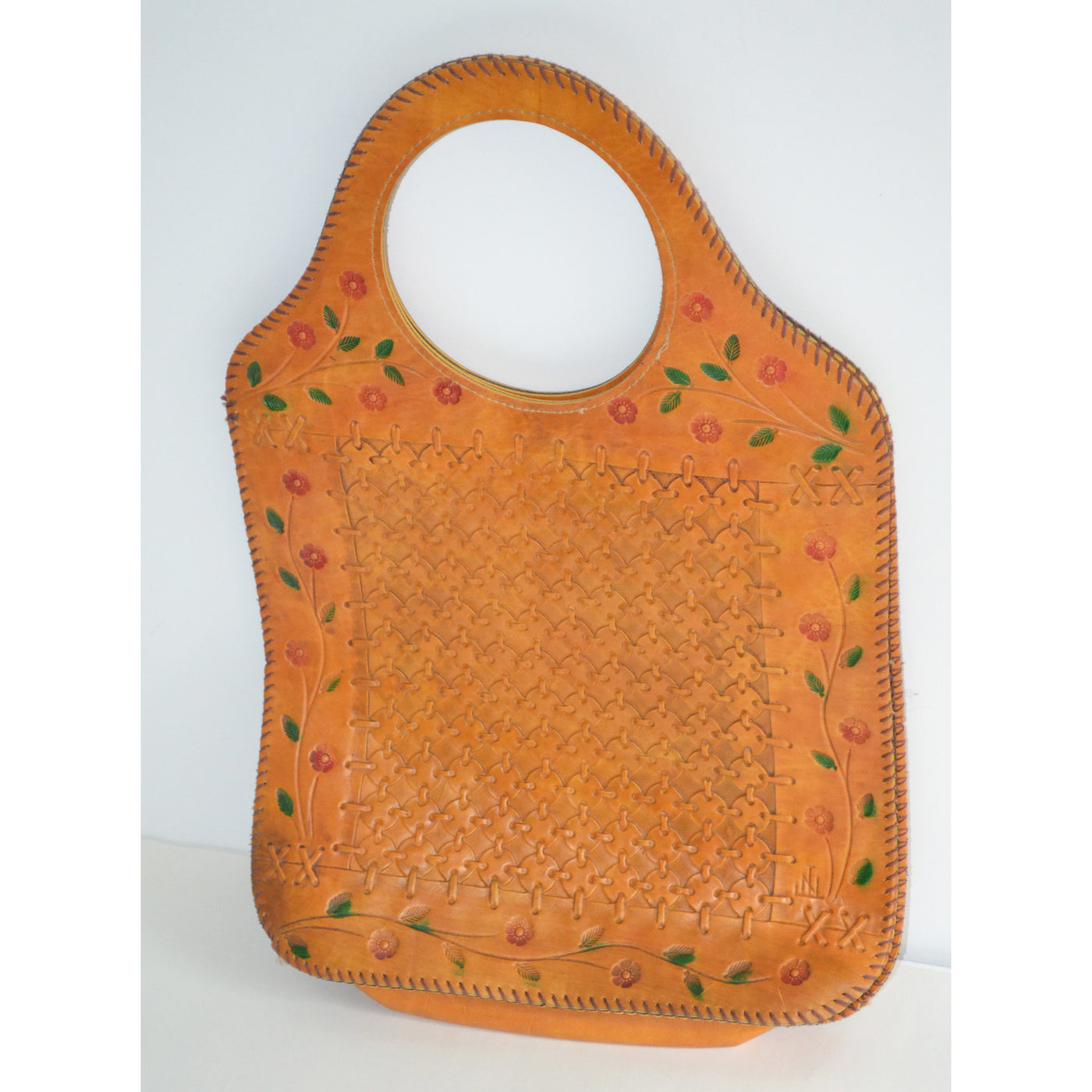 This vintage hippy tooled and woven leather hand painted tote is unlined with one vinyl pocket.