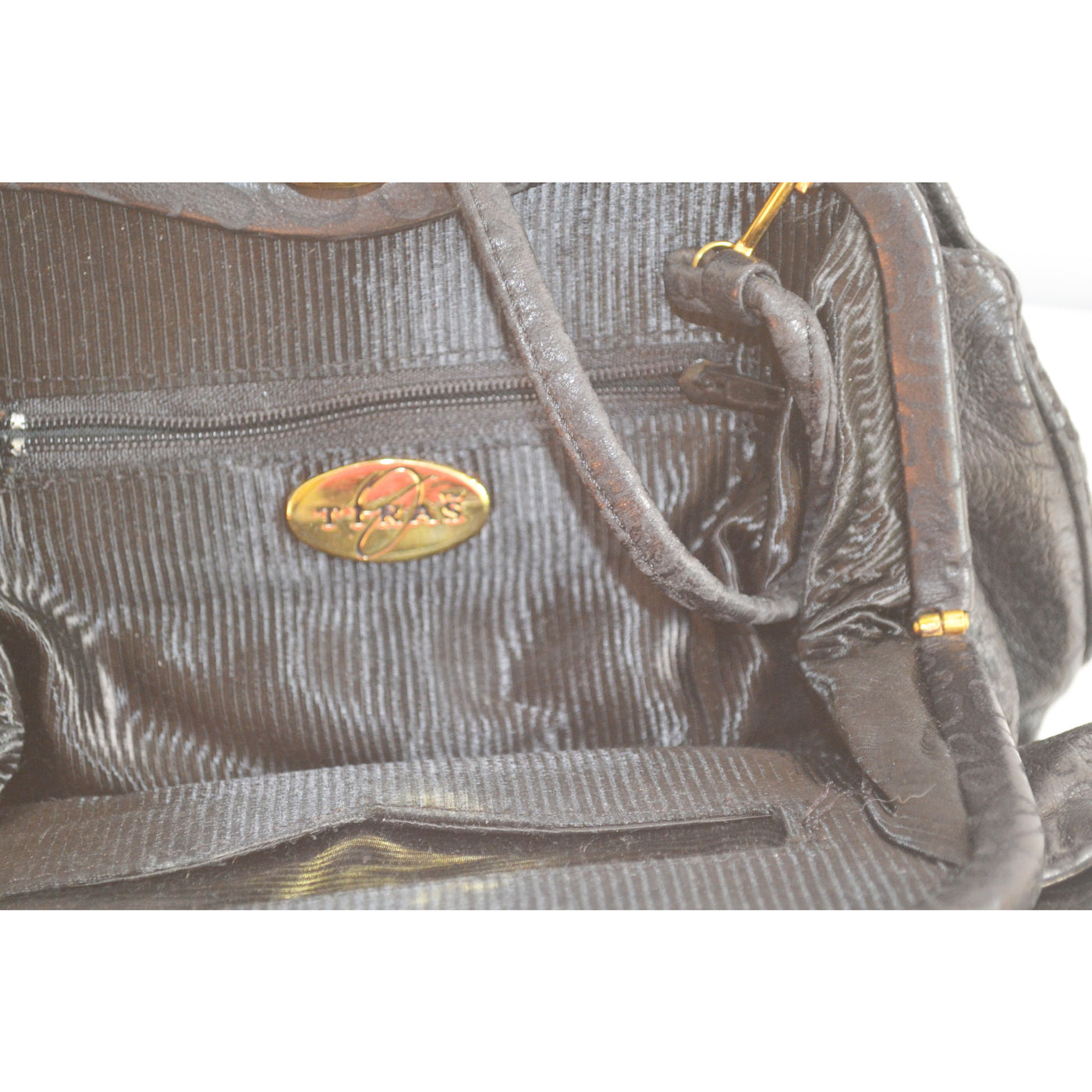 This embossed pleated black leather evening purse is from Tiras. Interior is fabric lined with two pockets (one zip). Has optional shoulder strap.